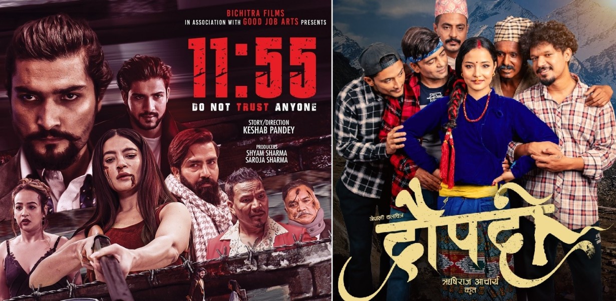 गत माघदेखि हरेक साता हलमा नयाँ नेपाली फिल्म टुटेका छैनन् । एकै मितिमा दुई-तीनवटासम्म फिल्म रिलिज भैरहेका छन् । यो साता पनि दुई फिल्म ‘११:५५’ र ‘द्रोपदी’ शुक्रबारबाट प्रदर्शनमा आएका छन् । यी दुवै फरक कथामा बनेका फिल्म हुन् । ‘११:५५’ क्राइम-थ्रिलर फिल्म हो । एउटा घरभित्र भएको ‘मर्डर’को कथामा फिल्म आधारित छ । ‘द्रोपदी’मा भने बहुपति प्रथाको कथा छ ।